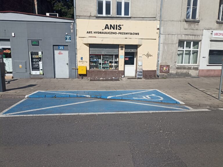 To podwójne miejsce postojowe dla osób z niepełnosprawnościami znajduje się w bardzo dogodnej lokalizacji – w sąsiedztwie sklepu Żabka, kościoła Świętej Barbary, szkoły, muzeum oraz urzędów publicznych. Dzięki pełnemu oznakowaniu (znaki pionowe i poziome) łatwo je zauważyć, a asfaltowa nawierzchnia…