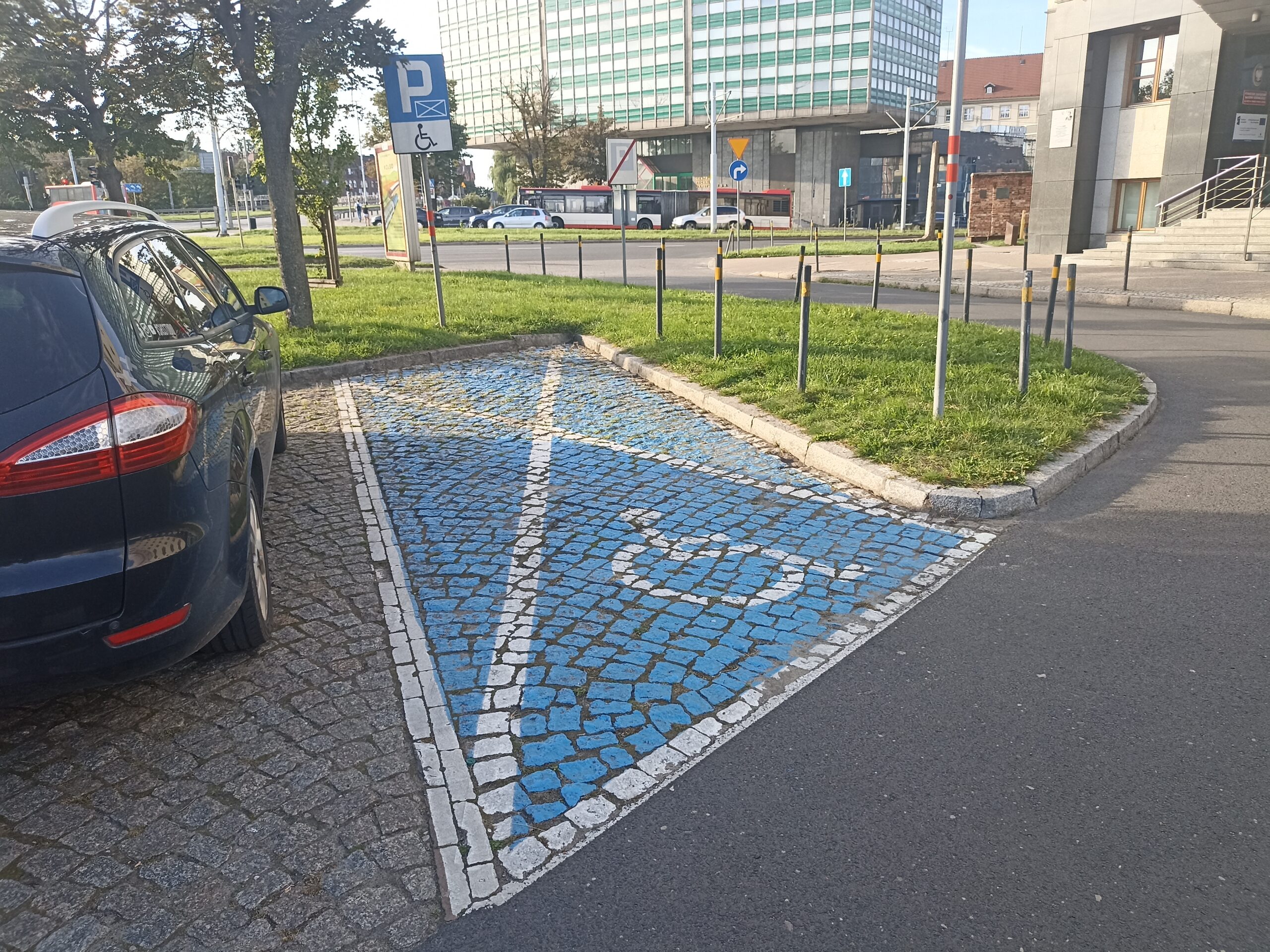 Przed wejściem do budynku Komisji Krajowej i Zarządu Regionu Gdańskiego NSZZ „Solidarność” znajduje się ogólnodostępne i bezpłatne miejsce parkingowe dla osób niepełnosprawnych. Stanowisko jest wykonane z kostki brukowej w bardzo dobrym stanie i posiada pełne oznakowanie pionowe oraz poziome, co zapewnia jego widoczność i prawidłowe użytkowanie. Układ skośny sprzyja wygodnemu manewrowaniu, a standardowa szerokość miejsca pozwala na swobodne wsiadanie i wysiadanie. Lokalizacja w bezpośrednim sąsiedztwie budynku sprawia, że osoby z niepełnosprawnościami mogą szybko i komfortowo dotrzeć do urzędu lub instytucji publicznej.