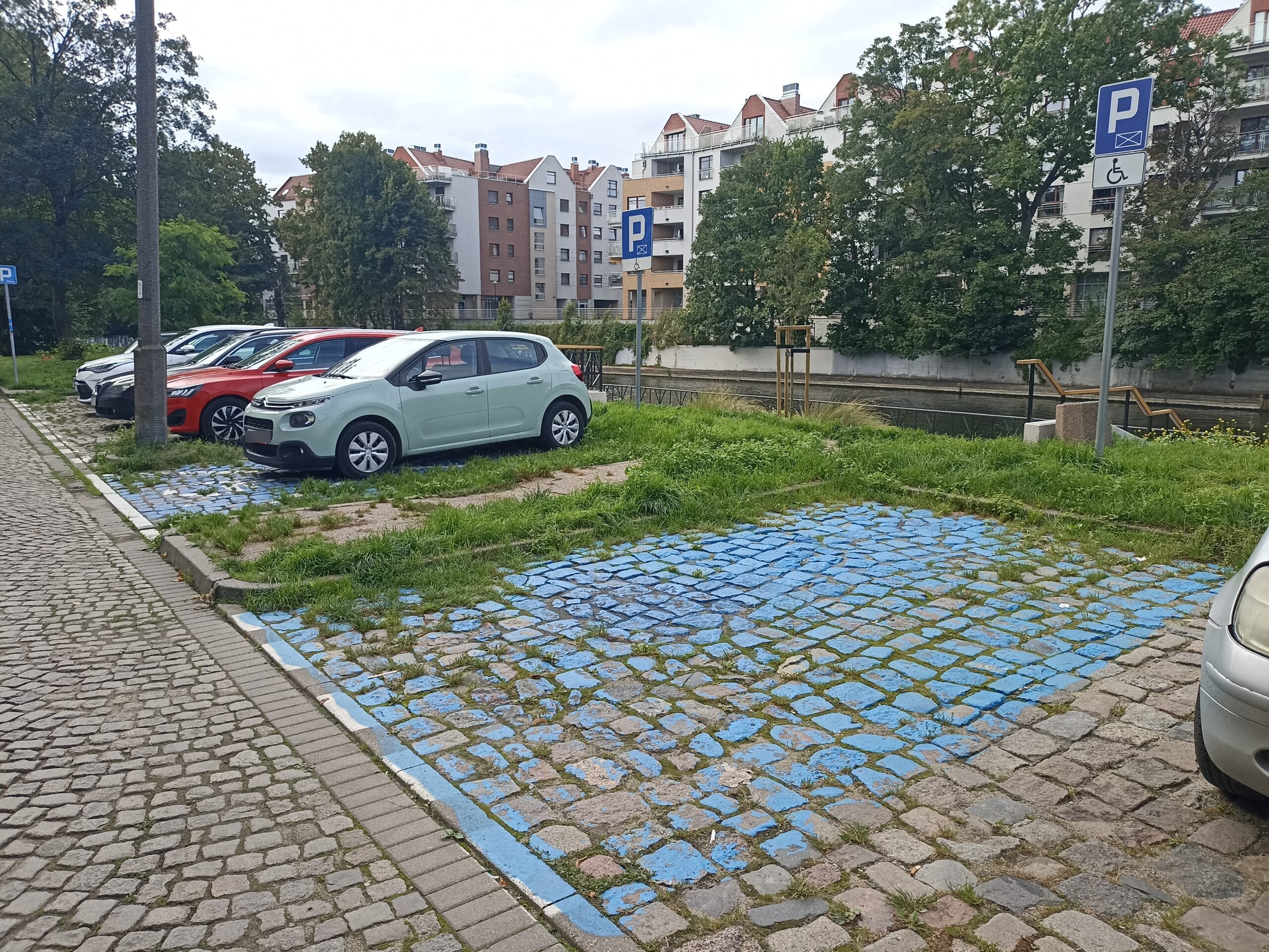 Na ulicy Dobra 4 w Gdańsku znajdują się dwa miejsca postojowe przeznaczone dla osób z niepełnosprawnościami. Są one zlokalizowane tuż przy wejściu do budynku, co znacznie ułatwia codzienne funkcjonowanie i zapewnia szybki dostęp do ważnych punktów. Parkowanie odbywa się prostopadle na równej kostce brukowej, a oznakowanie jest pełne – zarówno pionowe, jak i poziome, co ułatwia szybkie odnalezienie miejsca. Dodatkowym udogodnieniem jest dobre oświetlenie, które zwiększa bezpieczeństwo także wieczorem.