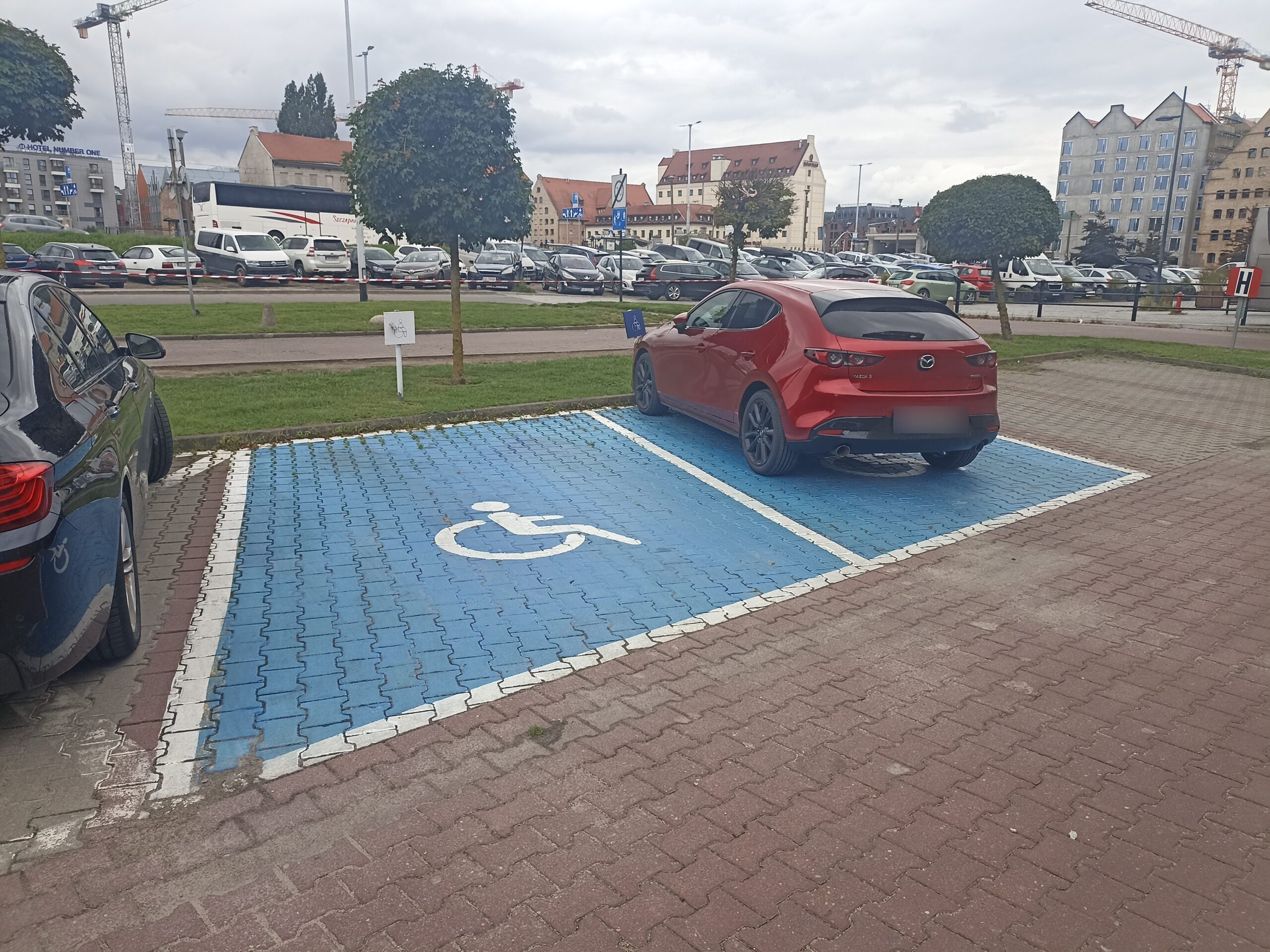 Na terenie hotelu Novotel w Gdańsku znajdują się dwa miejsca postojowe przeznaczone dla osób z niepełnosprawnością, zlokalizowane w bezpośrednim sąsiedztwie wejścia do budynku. Stan nawierzchni z kostki betonowej jest bardzo dobry, a miejsca są poszerzone, co ułatwia swobodne otwieranie drzwi i korzystanie z pojazdu osobom poruszającym się na wózkach inwalidzkich lub rodzinom z dziećmi. Parkowanie odbywa się skośnie, a teren jest dobrze oświetlony, jednak nie posiada ani zadaszenia, ani monitoringu. Warto wiedzieć, że stanowiska są w strefie płatnej – opłata pobierana jest poprzez parkomat lub aplikację mobilną, a czas parkowania nie jest limitowany.