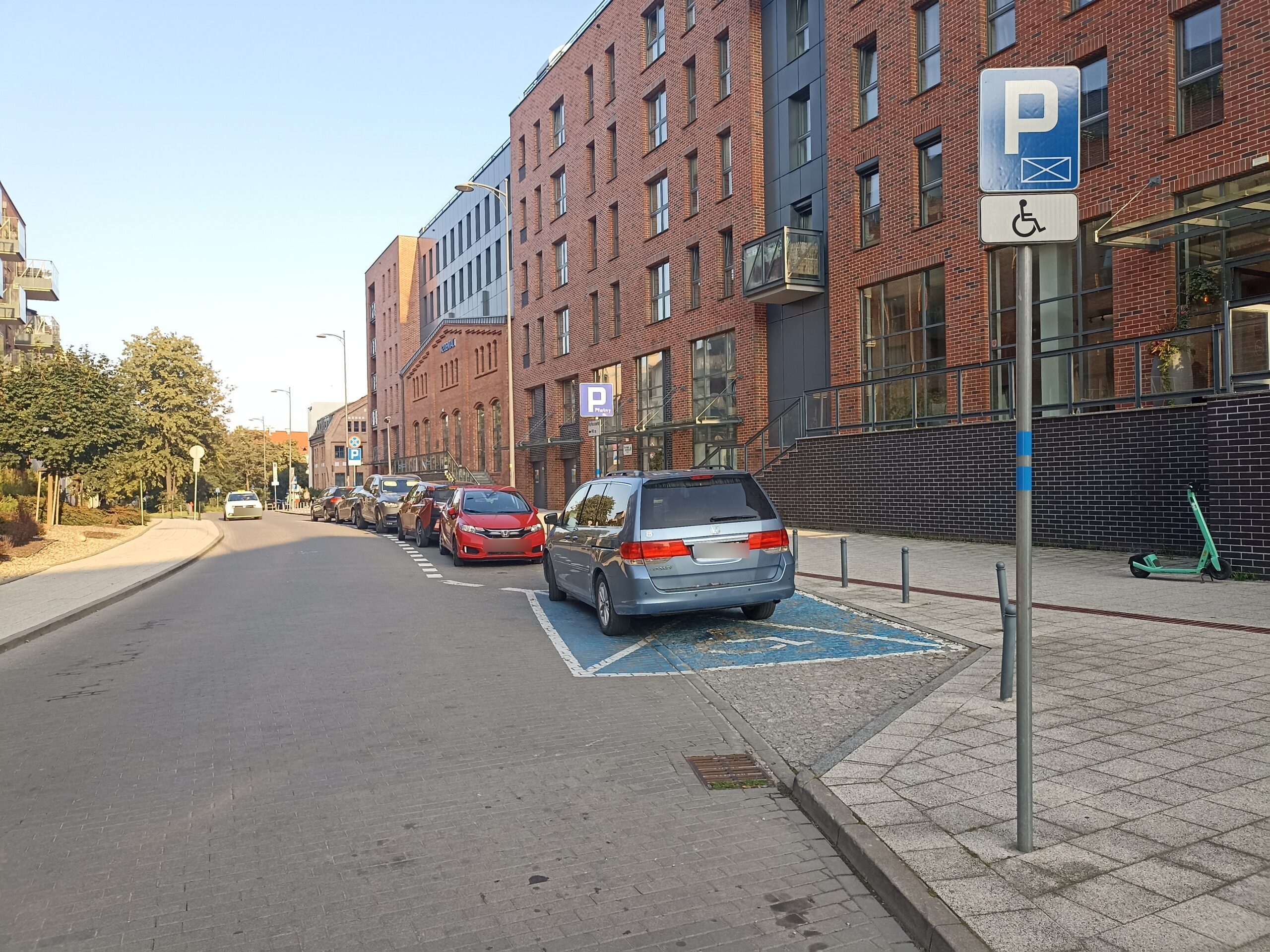 Stanowisko znajduje się tuż przy wejściu do budynku, co stanowi istotne udogodnienie. Parking należy do strefy płatnego parkowania (parkomat/aplikacja), lecz posiadacze karty parkingowej osoby niepełnosprawnej mogą korzystać z niego bezpłatnie. Obecne jest również oświetlenie, które poprawia bezpieczeństwo po zmroku. Brakuje natomiast zadaszenia, monitoringu i ładowarki dla pojazdów elektrycznych. Mimo drobnych ograniczeń, jest to praktyczne i komfortowe miejsce dla osób z ograniczoną mobilnością.