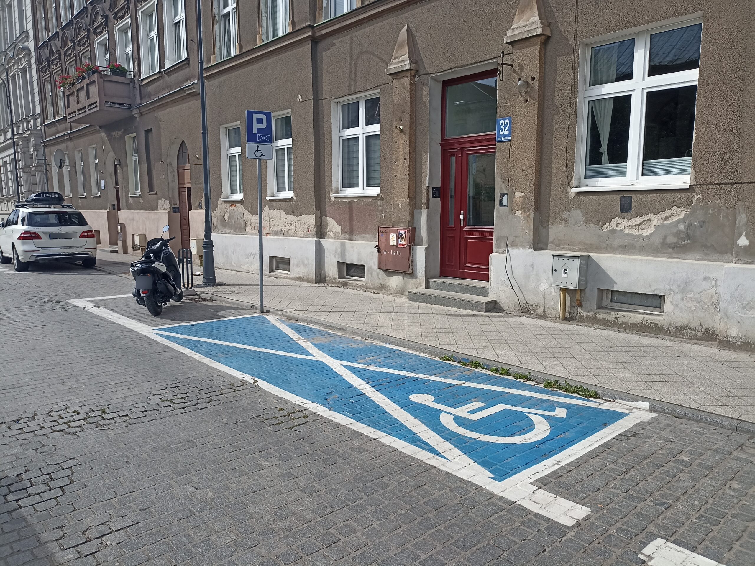 Przy ul. Łąkowej 32 w Gdańsku znajduje się dogodne miejsce parkingowe dla osób z niepełnosprawnościami, usytuowane po prawej stronie jezdni w kierunku jazdy. Dzięki takiej lokalizacji nie ma trudności przy wysiadaniu zarówno dla kierowcy, jak i pasażerów, co czyni to miejsce wyjątkowo praktycznym. Stanowisko posiada pełne oznakowanie pionowe i poziome, a nawierzchnia z kostki brukowej w bardzo dobrym stanie zapewnia stabilność i bezpieczeństwo.