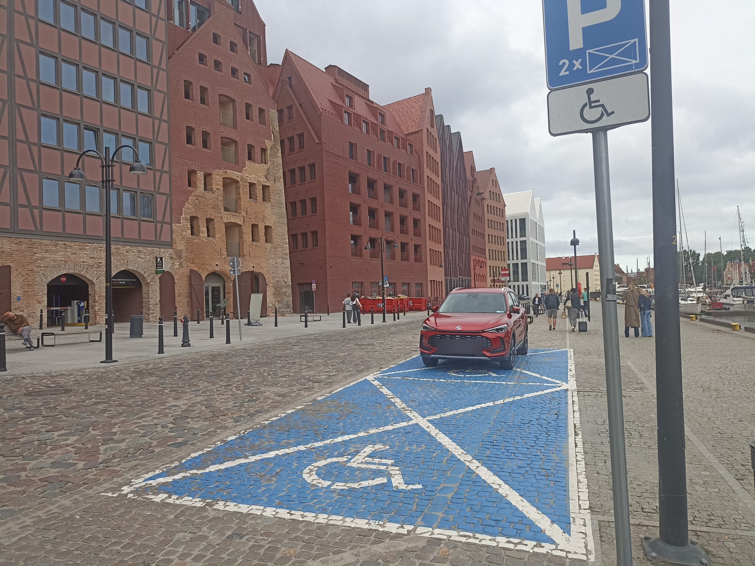 Na Wyspie Spichrzów, w samym centrum Gdańska, znajdują się dwa wygodne miejsca postojowe przeznaczone dla osób z niepełnosprawnościami. Stanowiska wykonane są z kostki brukowej w bardzo dobrym stanie i wyposażone w pełne oznakowanie pionowe oraz poziome, co sprawia, że są dobrze widoczne i łatwe do zidentyfikowania. Parkowanie odbywa się równolegle, a poszerzona szerokość miejsc zapewnia dodatkowy komfort podczas wsiadania, wysiadania czy korzystania z wózka inwalidzkiego.