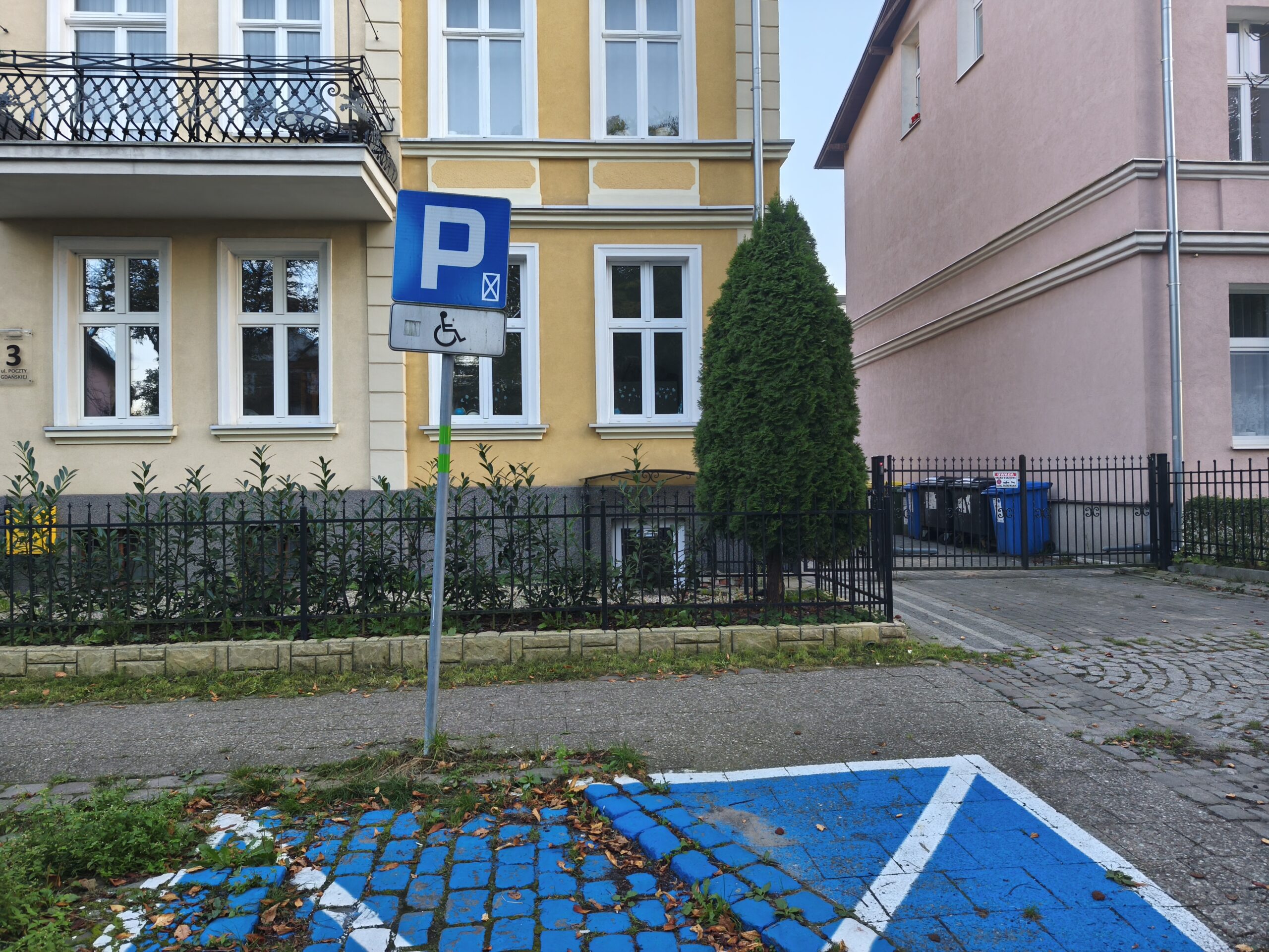 To poszerzone i w pełni oznakowane miejsce postojowe znajduje się tuż przy wejściu do budynku przy ulicy Poczty Gdańskiej 3 w Gdańsku, w bezpośrednim sąsiedztwie sklepu oraz dworca kolejowego / SKM. Dzięki pełnemu oznakowaniu pionowemu i poziomemu oraz utwardzonej nawierzchni z kostki betonowej, parkowanie jest wygodne i bezpieczne także dla kierowców poruszających się na wózkach. Miejsce jest oświetlone, co zwiększa widoczność po zmroku i zapewnia większy komfort oraz poczucie bezpieczeństwa.