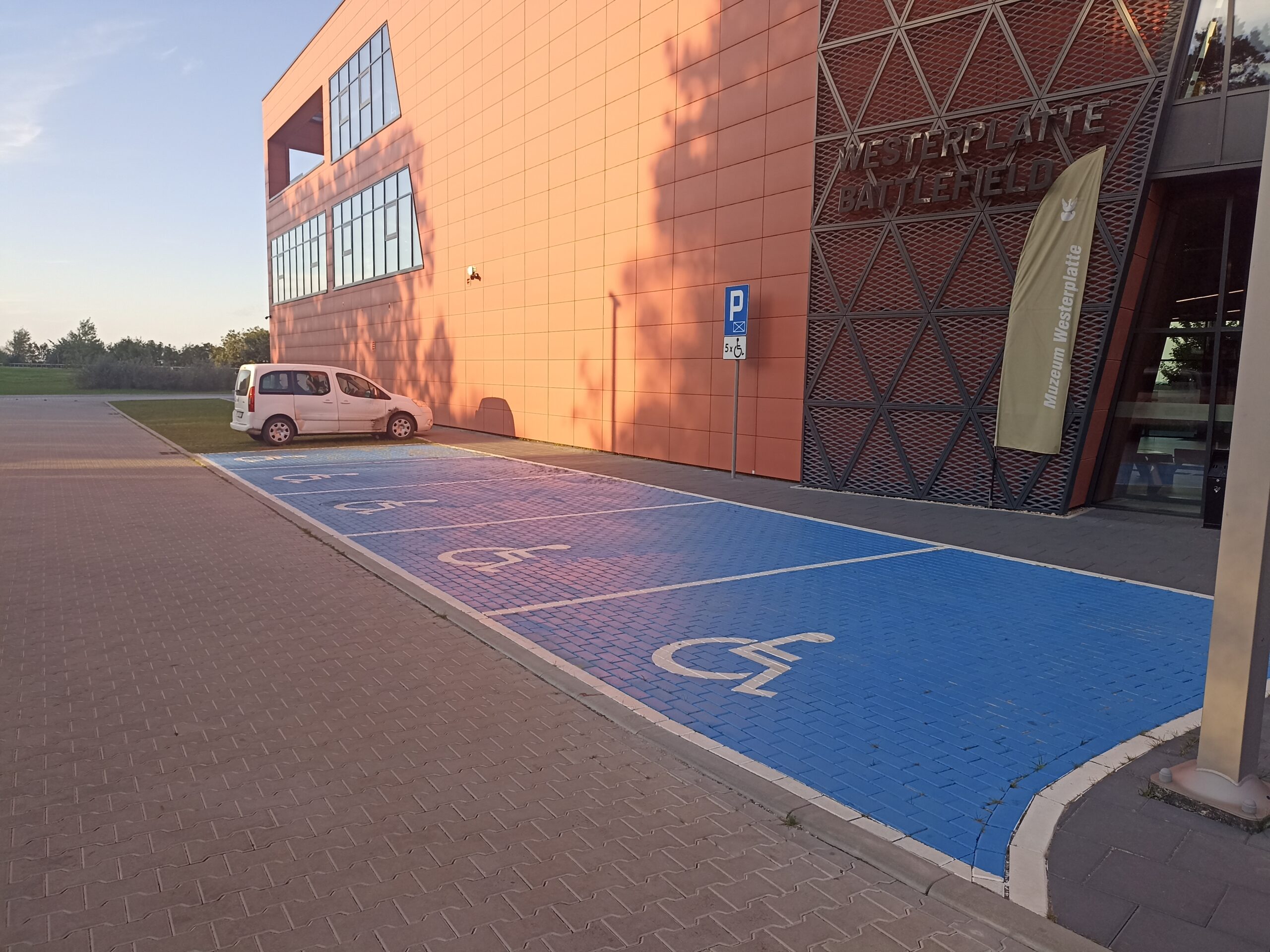Przy Muzeum II Wojny Światowej na terenie Pola Bitwy Westerplatte w Gdańsku znajduje się 5 miejsc postojowych dla osób z niepełnosprawnościami. Stanowiska wyznaczono na kostce betonowej w układzie prostopadłym. Miejsca są szerokie, w pełni oznakowane (pionowo i poziomo) oraz utrzymane w bardzo dobrym stanie, co zapewnia wygodę i bezpieczeństwo użytkowników. Dodatkowym atutem jest oświetlenie, które poprawia komfort parkowania również po zmroku.