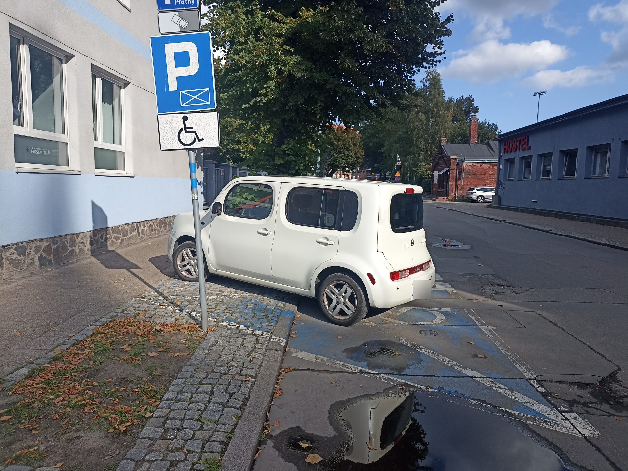 Miejsce jest ogólnodostępne, bezpłatne i dobrze oświetlone, co zapewnia bezpieczeństwo również po zmroku. W pobliżu znajduje się wejście do przychodni, szkoła oraz sklep, dzięki czemu osoby z ograniczoną mobilnością mogą wygodnie załatwić sprawy zdrowotne czy codzienne zakupy. To praktyczne i przemyślane miejsce postojowe, które zwiększa niezależność i komfort osób z niepełnosprawnościami.