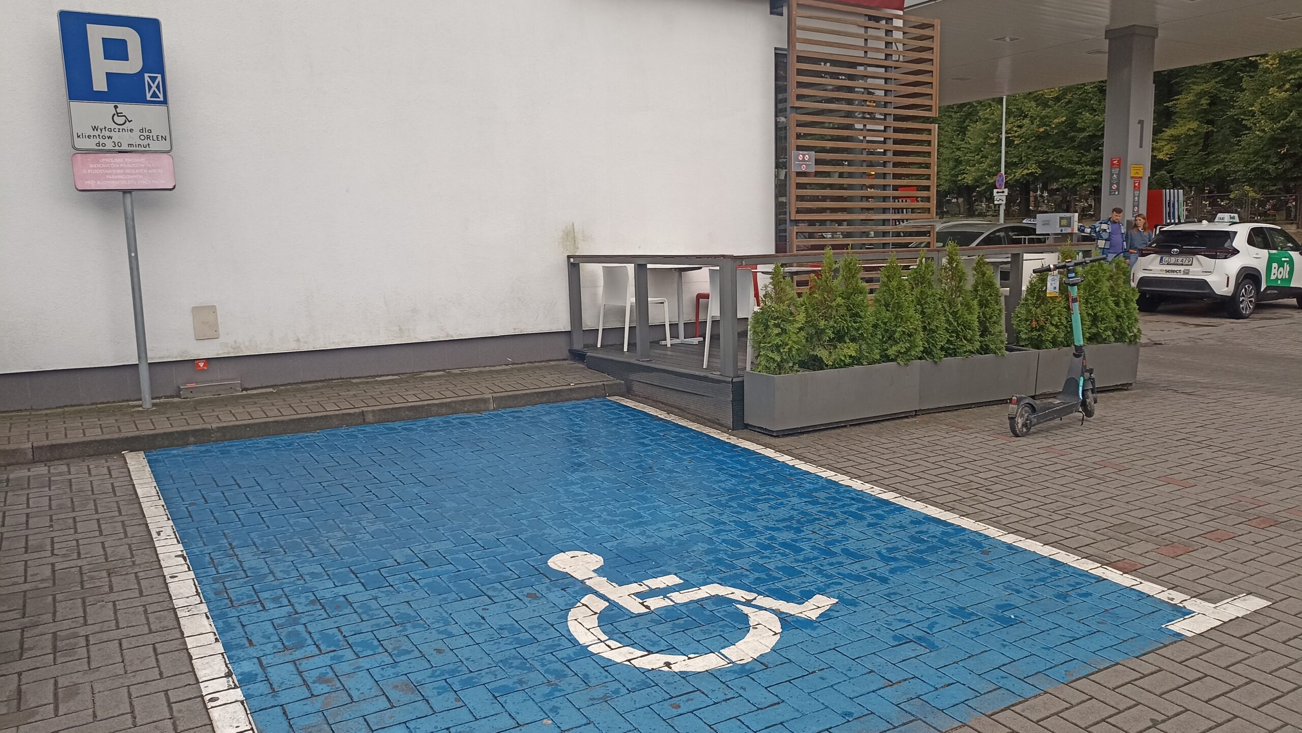Miejsce znajduje się w bezpośrednim sąsiedztwie wejścia do budynku i sklepu, co znacznie ułatwia codzienne zakupy czy szybkie sprawunki. Postój jest bezpłatny, z ograniczeniem czasowym – klienci stacji mogą parkować tutaj do 30 minut. Brak zadaszenia i monitoringu rekompensuje bliskość obiektu, a brak opłat oraz łatwy dostęp czynią to miejsce praktycznym i przyjaznym. Jest ono ogólnodostępne, z wygodnym układem prostopadłym, co dodatkowo ułatwia manewrowanie nawet większym pojazdom.