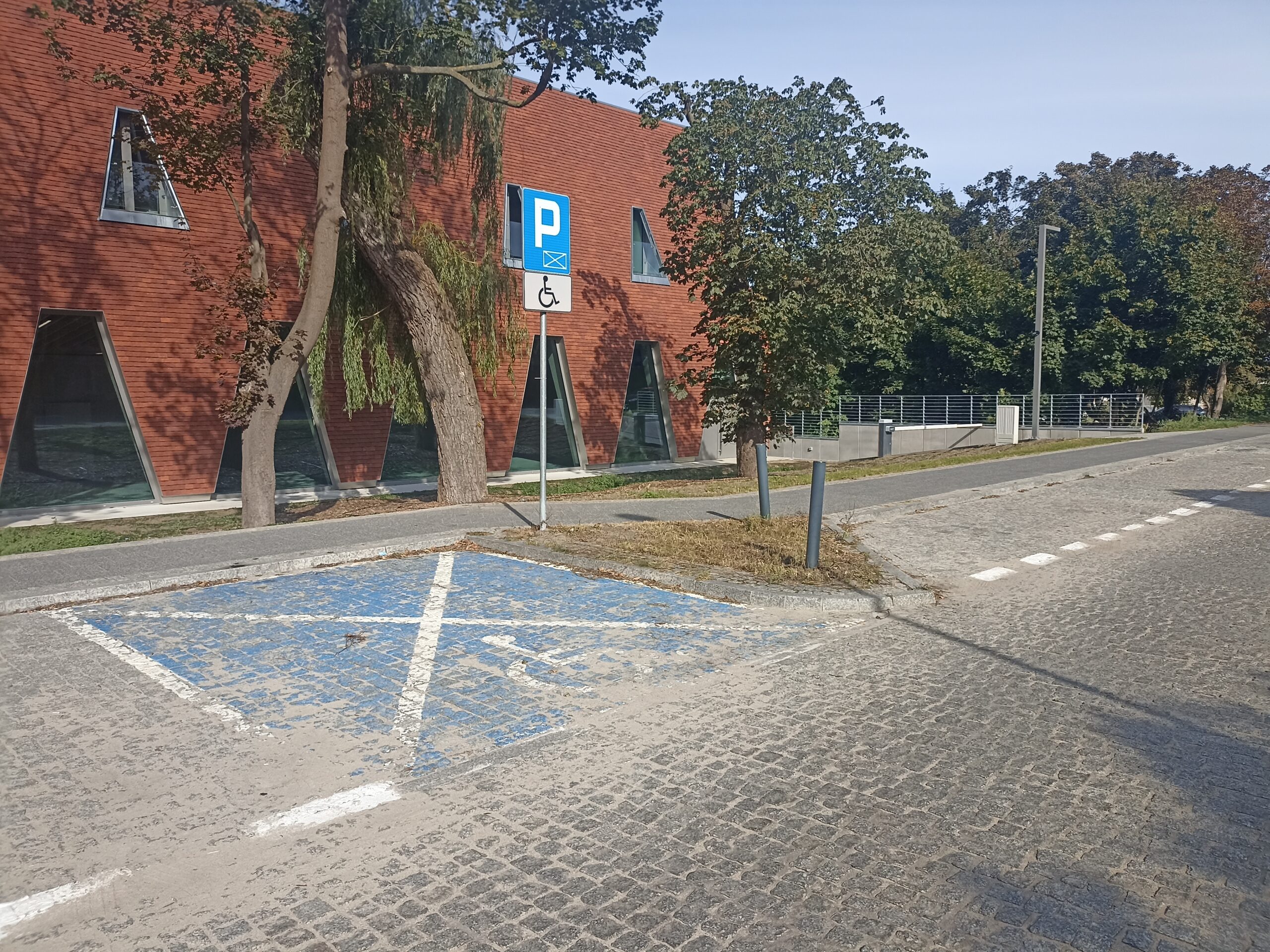 Przed Katedrą Stomatologii Gdańskiego Uniwersytetu Medycznego (GUMed) znajduje się jedno miejsce postojowe dla osób z niepełnosprawnościami, przygotowane z myślą o pacjentach i odwiedzających. Miejsce jest prostopadłe, z pełnym oznakowaniem pionowym i poziomym, co zapewnia jego dobrą widoczność i bezpieczeństwo podczas parkowania. Nawierzchnia z kostki brukowej jest równa i utrzymana w bardzo dobrym stanie, co ułatwia wysiadanie z pojazdu i poruszanie się wózkiem. Dodatkowym atutem jest bliskość wejścia do budynku oraz przystanku komunikacji miejskiej, co znacznie poprawia dostępność dla osób o ograniczonej mobilności.
