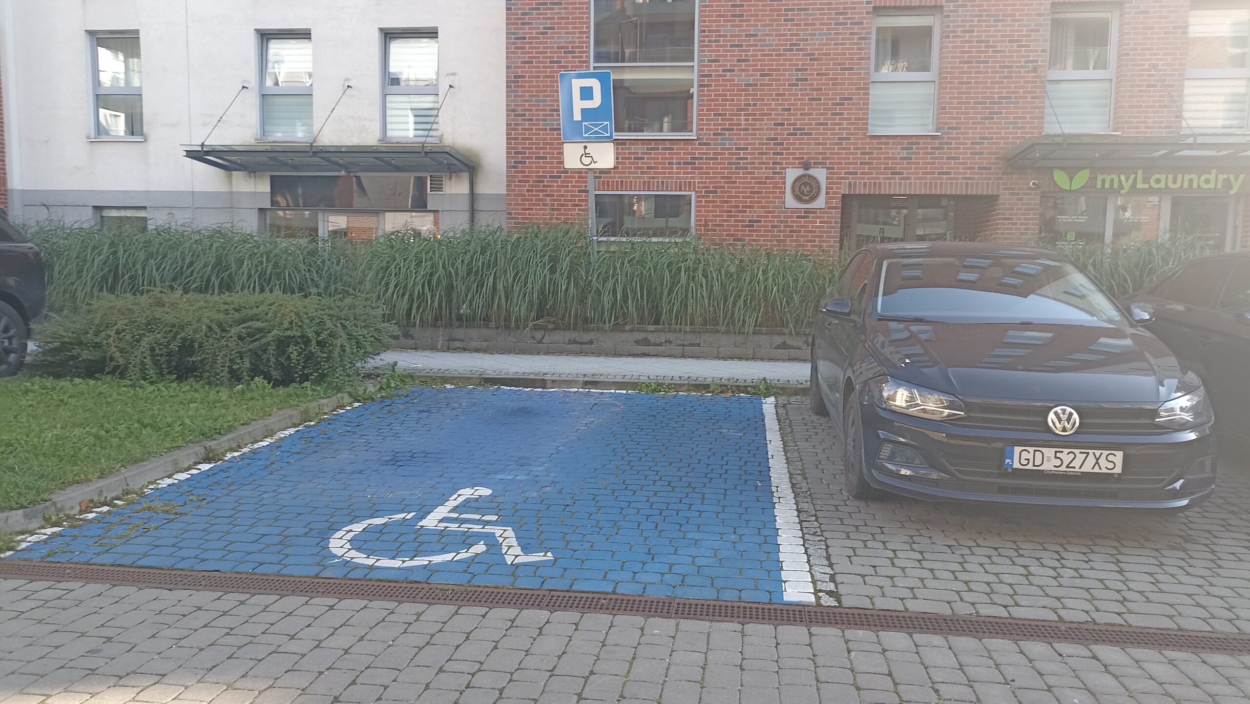 Szerokie miejsce postojowe na nawierzchni z kostki betonowej w sąsiedztwie osiedla mieszkaniowego.