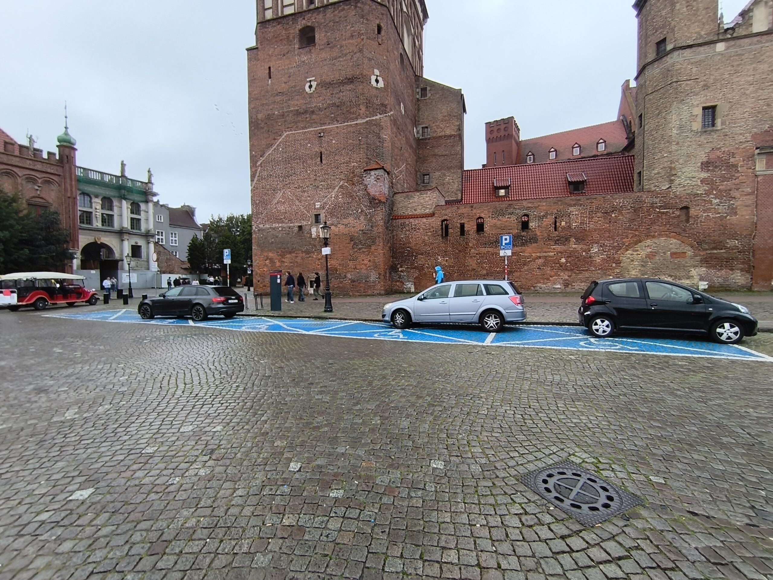 Przy Katowni na Targu Węglowym w Gdańsku znajduje się aż 5 ogólnodostępnych miejsc postojowych dla osób z niepełnosprawnościami. Miejsca zostały wyznaczone na kostce brukowej, mają pełne oznakowanie (pionowe i poziome) i są szerokie, co znacząco ułatwia wsiadanie i wysiadanie, również w przypadku korzystania z wózka inwalidzkiego. Parkowanie odbywa się w układzie równoległym, a cała przestrzeń jest utrzymana w bardzo dobrym stanie. Dodatkowym udogodnieniem jest oświetlenie, zapewniające bezpieczeństwo także po zmroku.