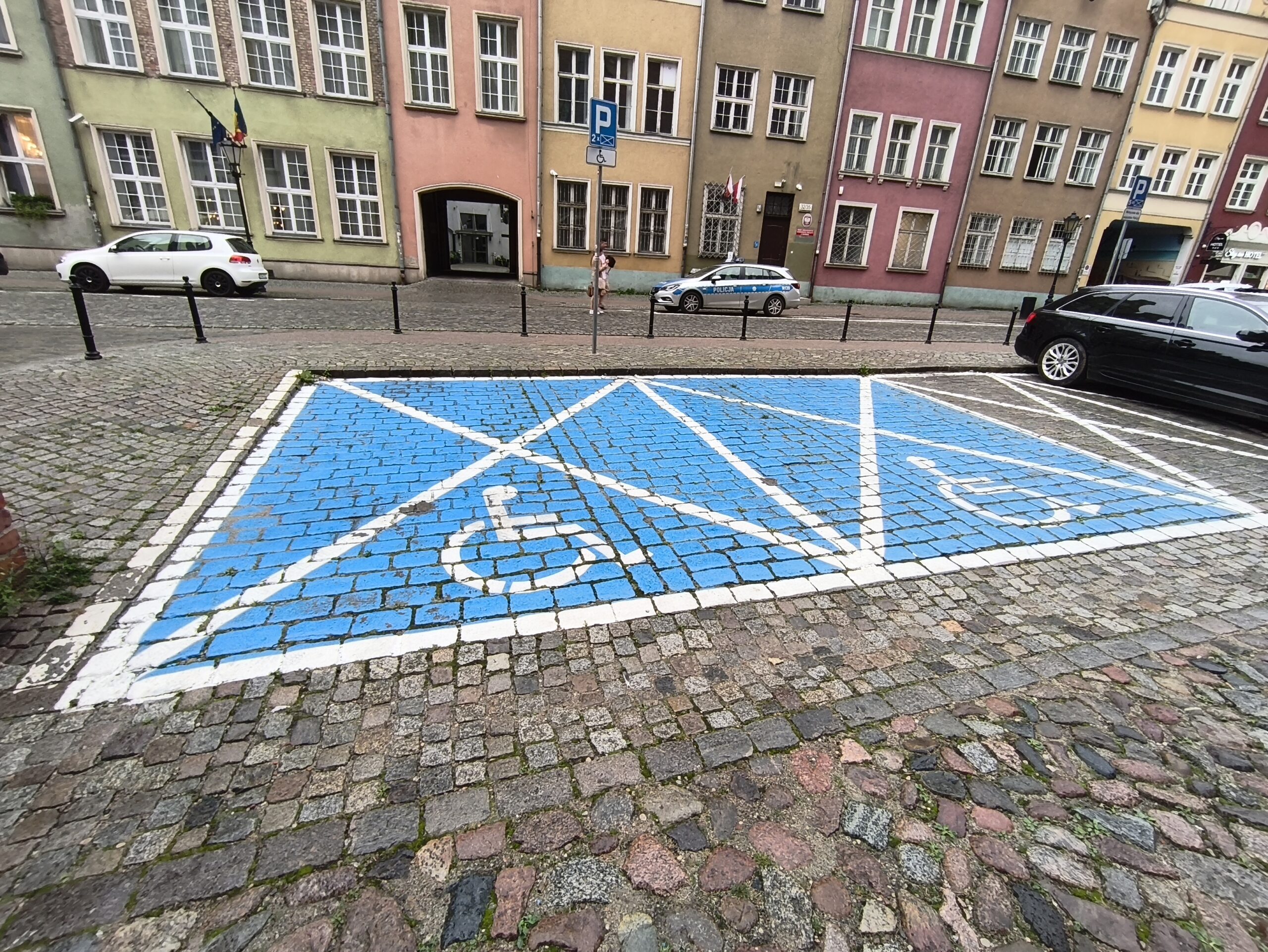 Przy wyłożonym kostką brukową placu obok Bazyliki Mariackiej znajdują się dwa ogólnodostępne miejsca postojowe dla osób z niepełnosprawnościami. Stanowiska mają standardową szerokość i ustawione są prostopadle, co ułatwia wjazd i wyjazd. Miejsca są dobrze oznakowane – zarówno pionowo, jak i poziomo – dzięki czemu łatwo je zlokalizować i bezpiecznie z nich korzystać. Oświetlenie zapewnia komfort użytkowania także po zmroku, a bardzo dobry stan nawierzchni dodatkowo podnosi wygodę. Choć stanowiska znajdują się w strefie płatnego parkowania, korzystanie z nich jest bezpłatne i nie ma ograniczeń czasowych.
