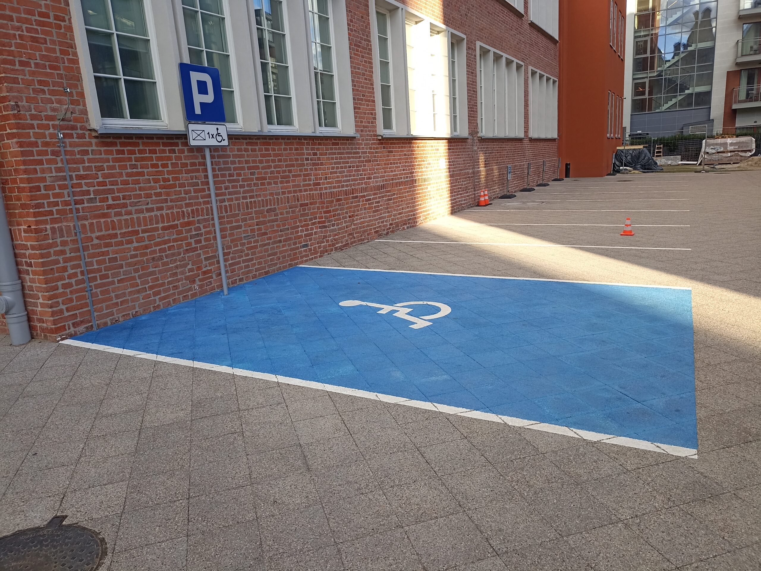 Na dziedzińcu Urzędu Wojewódzkiego przy ul. Chmielnej w Gdańsku znajduje się wydzielone miejsce postojowe tuż przy wejściu do budynku, co zapewnia osobom niepełnosprawnym wyjątkowo wygodny dostęp do instytucji. Aby z niego skorzystać, należy przejechać przez bramę przy ochronie – pracownicy potwierdzili, że miejsce to przeznaczone jest nie tylko dla pracowników, ale także dla osób z niepełnosprawnościami. Nawierzchnia wykonana z kostki betonowej jest w bardzo dobrym stanie, a pełne oznakowanie (pionowe i poziome) ułatwia szybkie odnalezienie stanowiska.